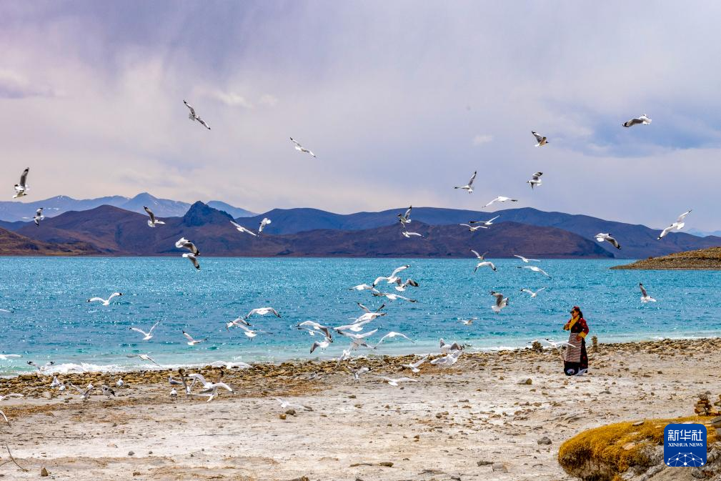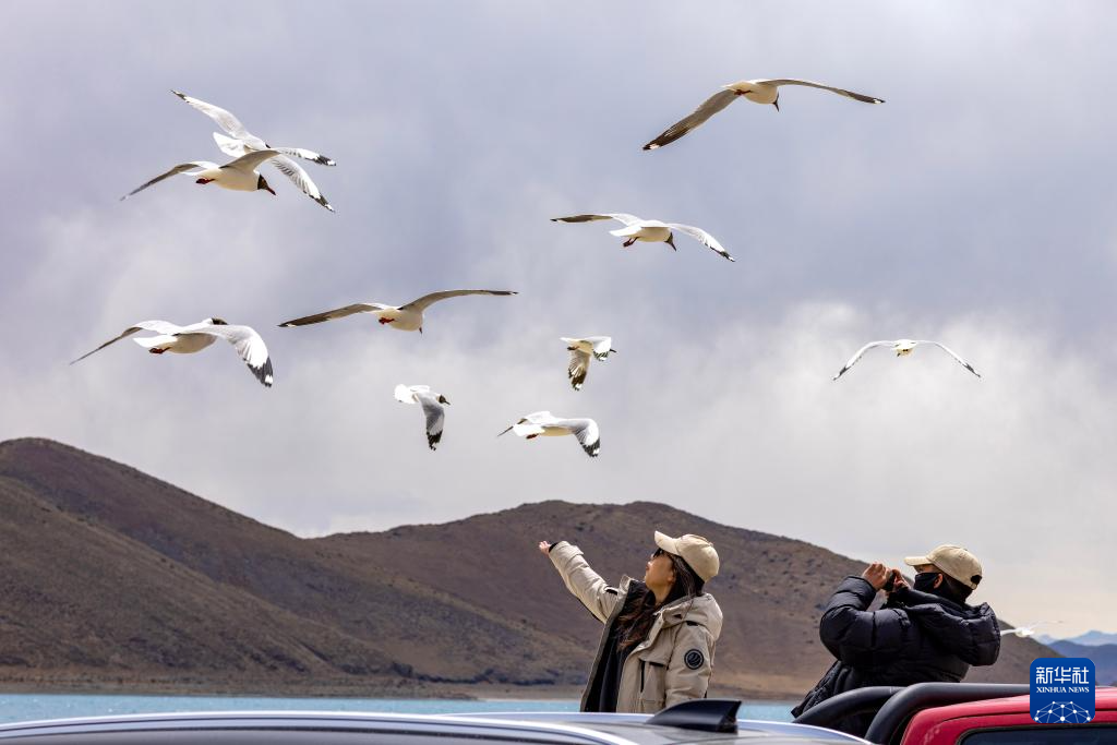 游客在羊卓雍錯(cuò)岸邊投喂棕頭鷗(4月5日攝)。新華社記者 姜帆 攝