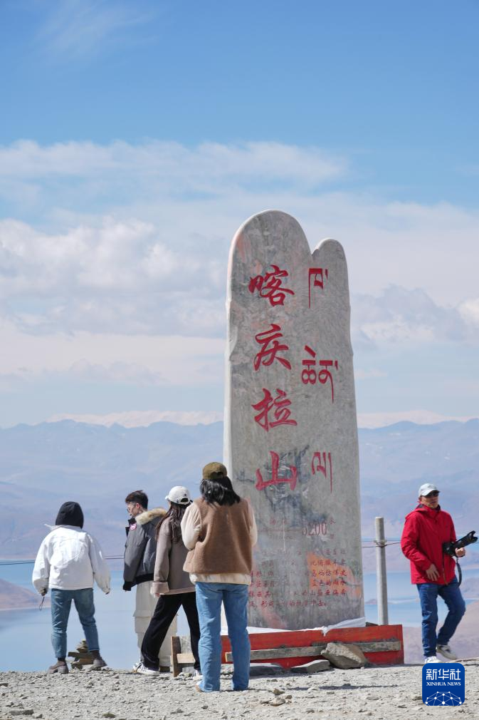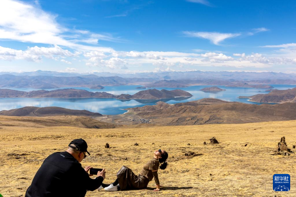 游客在喀慶拉山上以羊卓雍錯(cuò)為背景拍照(4月5日攝)。新華社記者 姜帆 攝