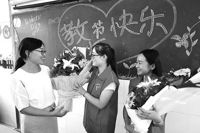 教師節(jié),學(xué)生們向老師獻(xiàn)花致敬。資料圖片