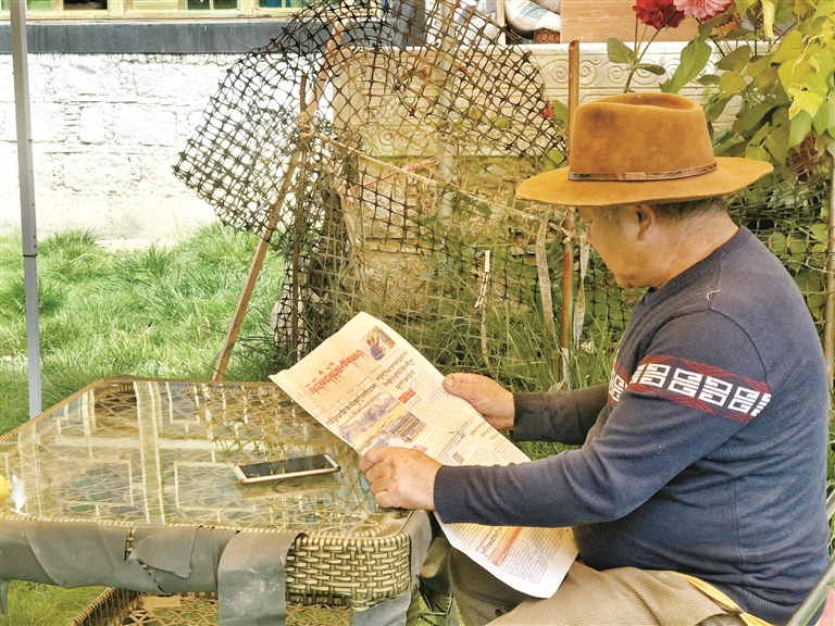 圖為西藏拉薩市曲水縣村民在自家院子搭建的四季常綠涼棚里讀書(shū)看報(bào)。記者 靳敏 攝