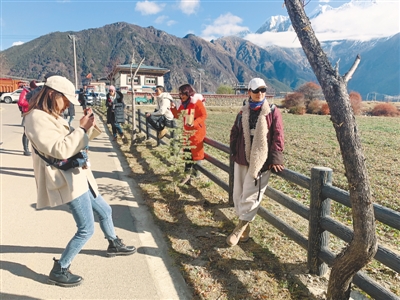 圖為近日,在西藏林芝雅魯藏布大峽谷內(nèi)派鎮(zhèn)達(dá)林村,來自內(nèi)地的游客在觀賞鄉(xiāng)村風(fēng)景,并拍照留念。記者 張猛 王珊 史金茹 攝
