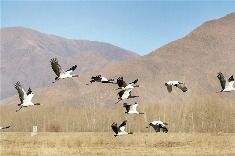 隨著氣溫逐漸下降,大批遷徙候鳥(niǎo)來(lái)到西藏拉薩市。在拉薩河谷、拉魯濕地、宗角祿康公園及田間地頭,成群結(jié)隊(duì)的鳥(niǎo)兒在波光粼粼的水面上時(shí)而低頭覓食、時(shí)而嬉戲、時(shí)而悠閑飛舞,冬日的高原呈現(xiàn)出一派生機(jī)勃勃的景象。圖為拉薩市達(dá)孜區(qū)田野上空飛翔的黑頸鶴。記者 平措旺堆 攝