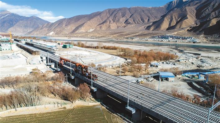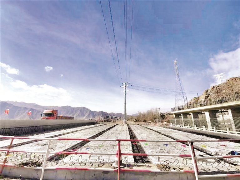 目前,正在架設的桑日車站四線特大橋,為拉林鐵路全線首座四線橋,全長253.4米,由28孔32m簡支T梁組成,該橋鋪架完成后將直接進入桑日車站站臺位置。