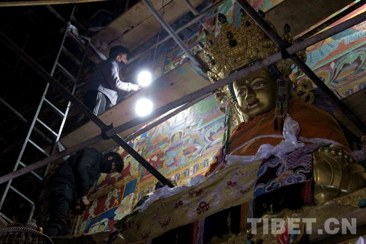 圖為扎巴旦增等類烏齊縣唐卡畫(huà)師們站在簡(jiǎn)易腳手架上,借著燈光,修復(fù)壁畫(huà) 攝影:李元梅