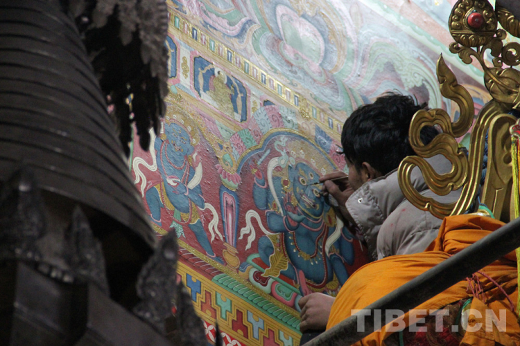 1320年,二世法臺(tái)鄔金貢布按照桑吉翁遺囑,邀請(qǐng)了尼泊爾藝術(shù)家雜雅、拉薩人貢唐巴·旺措蚌、多康·索朗本等人修建了查杰瑪大殿。大殿建成后尼泊爾藝術(shù)家在大殿底層內(nèi)壁及外廊、內(nèi)廊等墻面繪制了壁畫(huà)。幾百年來(lái),當(dāng)年極具尼泊爾藝術(shù)風(fēng)格的壁畫(huà)已依稀斑駁,當(dāng)?shù)卣M織了本地唐卡畫(huà)師對(duì)壁畫(huà)進(jìn)行修復(fù)。圖為畫(huà)師們?cè)诖蟮钜粚印盎ǖ睢眱?nèi)修復(fù)壁畫(huà) 攝影:李元梅