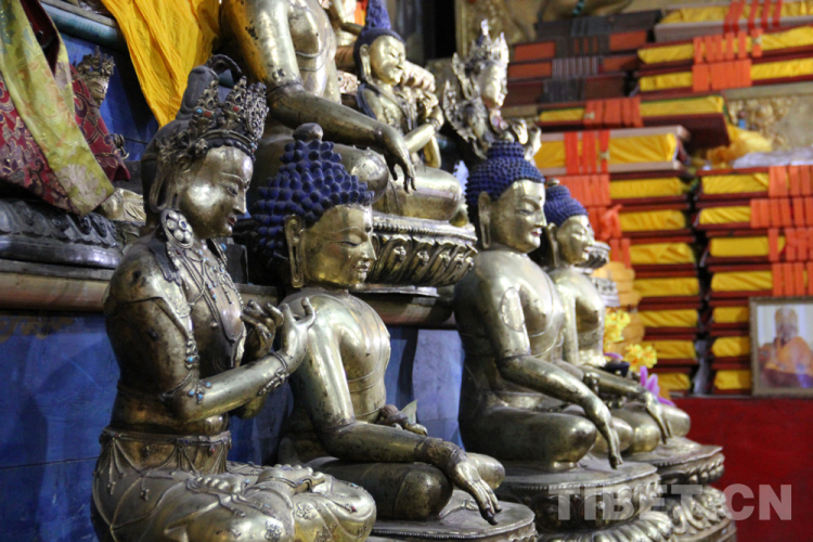 查杰瑪大殿內(nèi)供奉著金、銀、烏銅、檀香木等材料制作的4萬(wàn)多件藏傳佛教造像,在大殿中,不經(jīng)意間就會(huì)與不少國(guó)家級(jí)文物和高僧大德的塑像相遇。圖為查杰瑪大殿二層“紅殿”內(nèi)供奉的釋迦牟尼佛水印像,相傳為釋迦牟尼在世時(shí)鑄造。 攝影:李元梅