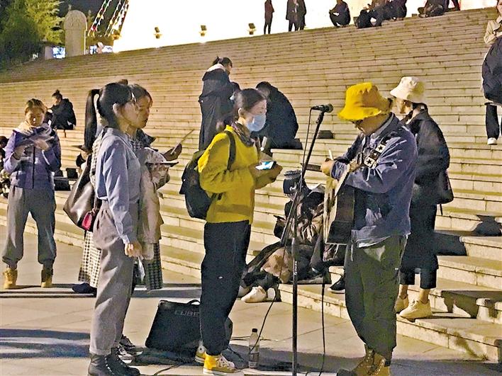 流浪歌手在劇場外傾情獻(xiàn)唱。