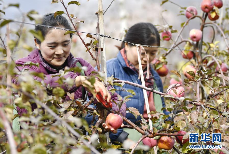 在林芝市米林縣羌納鄉(xiāng)西藏林芝現代蘋果標準化園區(qū),務工人員在采摘蘋果(11月22日攝)。新華社記者 張汝鋒 攝