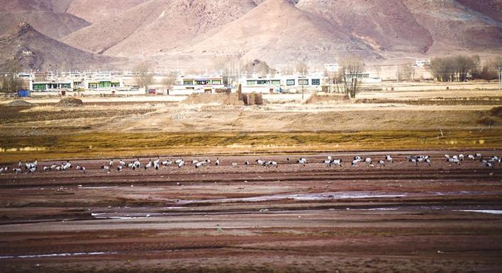 虎頭山水庫里鶴群正在河邊梳理羽毛,姿態(tài)十分優(yōu)雅。不一會(huì)兒,開始成群飛走,我們跟隨鶴群來到了附近村莊,蹁躚的鶴群,蒼黃的野草,清澈的湖泊,壯美的日出,散漫的牛羊,獨(dú)特的藏式民居,裊裊的炊煙……當(dāng)下,林周縣黑頸鶴國家級(jí)自然保護(hù)區(qū)進(jìn)入了觀鶴拍鶴的最佳時(shí)節(jié)。