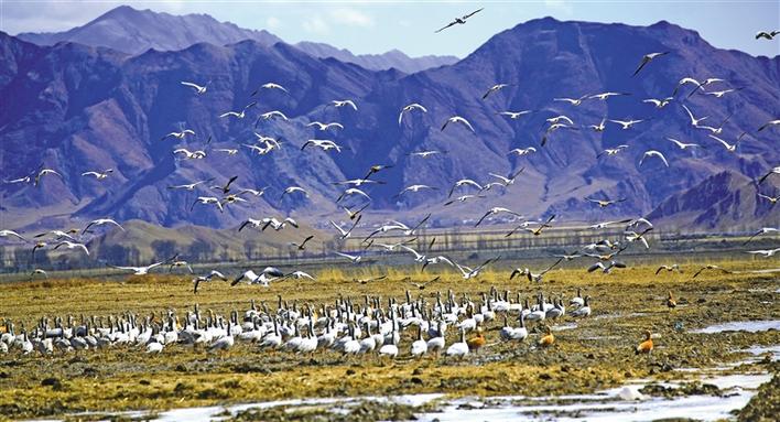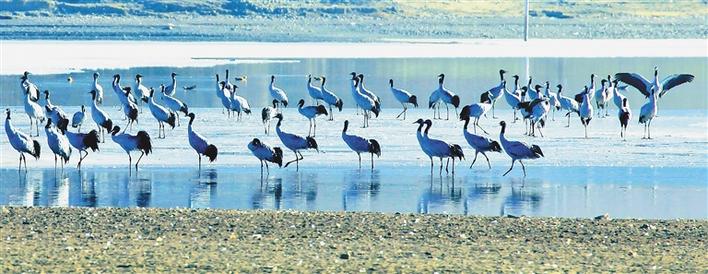 在冬日暖陽(yáng)的照耀下,成群結(jié)隊(duì)的鳥兒在河面上、濕地里盡情嬉戲,赤麻鴨悠然戲水、斑頭雁低聲吟唱、黑頸鶴翩翩起舞……一派熱鬧的景象。