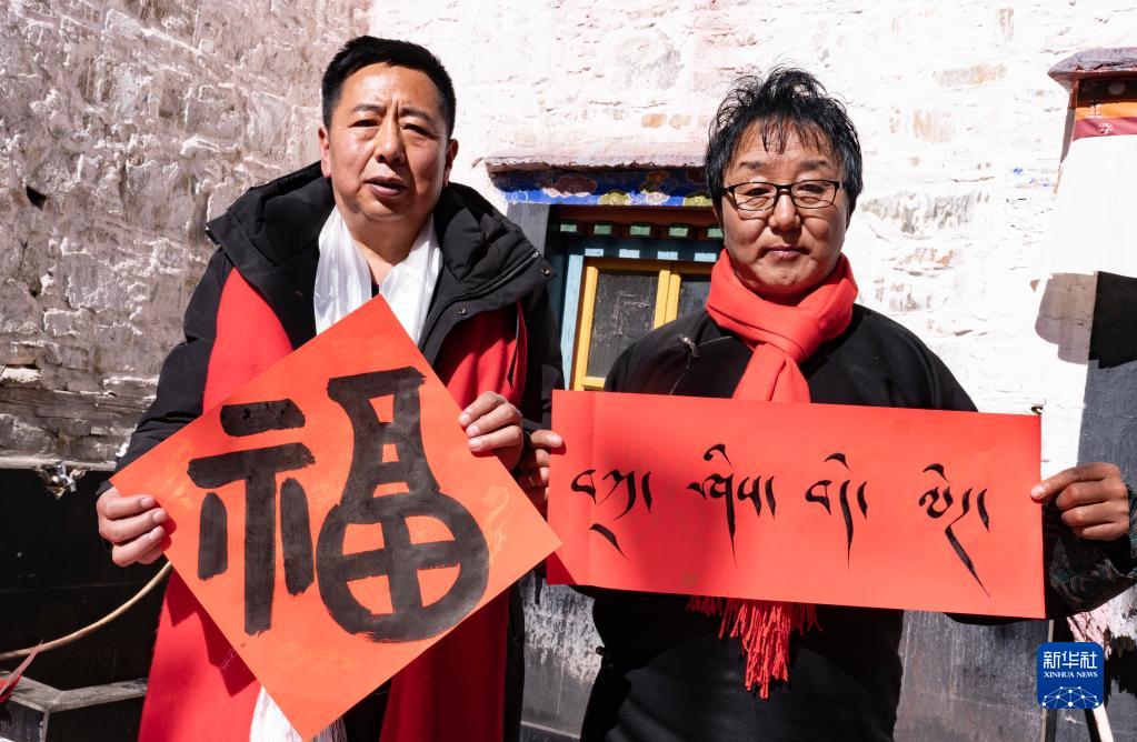 1月26日,書(shū)法家展示現(xiàn)場(chǎng)書(shū)寫(xiě)的祝福字。新華社記者 普布扎西 攝