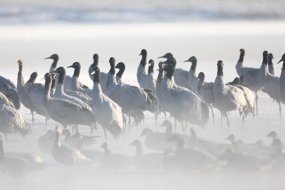 近日,西藏拉薩市林周縣迎來降雪,位于林周縣境內的黑頸鶴保護區(qū)變成了粉妝玉砌的世界,黑頸鶴與白皚皚的大雪相互點綴,構建出一幅自然和諧的冬日畫卷。