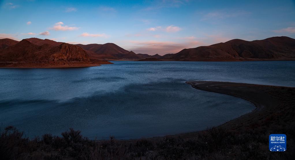 這是夕陽下的羊卓雍錯(1月1日攝)。新華社記者 姜帆 攝
