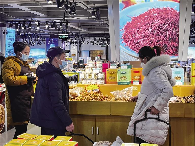 1月9日,記者來到西藏特產(chǎn)倉儲超市(乃倉店)進(jìn)行實地走訪。走進(jìn)超市,牦牛肉干、藏紅花、藏香豬肉、酥油茶、靈芝孢子粉等數(shù)百種西藏特產(chǎn)讓人眼花繚亂。雖是工作日,但前來購買特產(chǎn)的市民絡(luò)繹不絕?!榜R上過年了,想挑選一些西藏特產(chǎn)帶回去?!鼻皝碣徺I特產(chǎn)的李女士說,“今天主要買了西藏本地產(chǎn)的蟲草酒和藏蜜,送長輩很合適。”