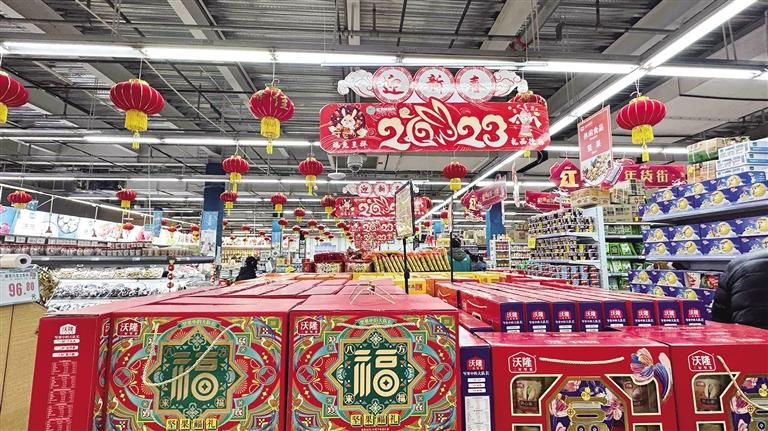 新年到,購(gòu)買(mǎi)年貨不可少。走進(jìn)大麥超市,寫(xiě)有“新年快樂(lè)”字樣的標(biāo)語(yǔ)牌隨處可見(jiàn),一副副寓意吉祥的對(duì)聯(lián)、各式各樣的“?!弊?、燈籠等新年裝飾,把春節(jié)的氣氛烘托得喜慶十足。貨架上,新鮮蔬菜、米面糧油、糖果點(diǎn)心、酒水飲料等熱銷年貨種類繁多、一應(yīng)俱全,人們喜氣洋洋地穿梭在貨架旁,精心挑選著心儀的物品。市民張女士正在挑選對(duì)聯(lián),她告訴記者:“今年我們?nèi)叶荚诶_過(guò)年,想把家里好好裝飾一下,讓過(guò)年的氛圍更濃一些。新年要有新氣象,我希望家人平平安安、健健康康。”