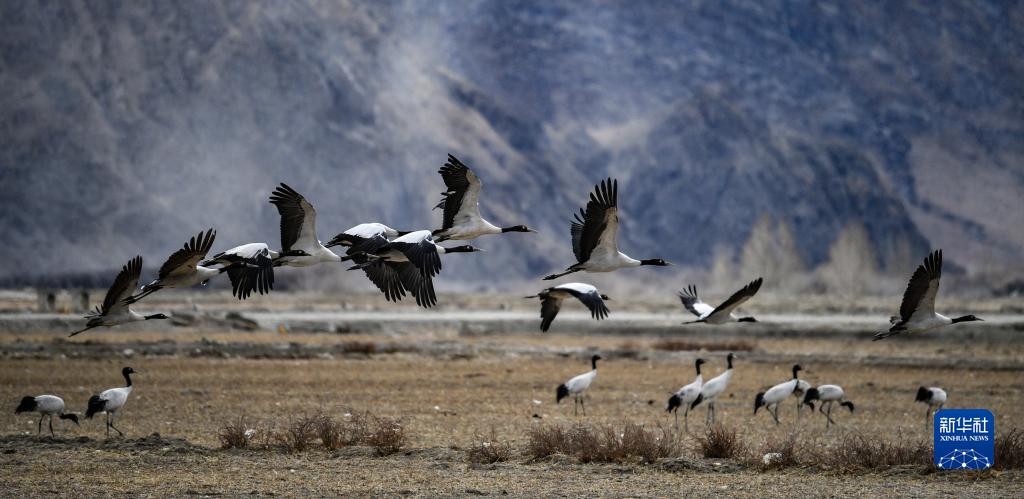 在西藏雅魯藏布江中游河谷黑頸鶴國家級自然保護(hù)區(qū)日喀則片區(qū)拉孜縣附近,大量越冬的黑頸鶴翩翩起舞,迎接春天的到來。