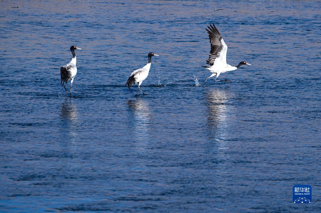 在西藏雅魯藏布江中游河谷黑頸鶴國家級自然保護(hù)區(qū)日喀則市拉孜縣越冬的黑頸鶴(1月23日攝)。新華社記者 孫非 攝