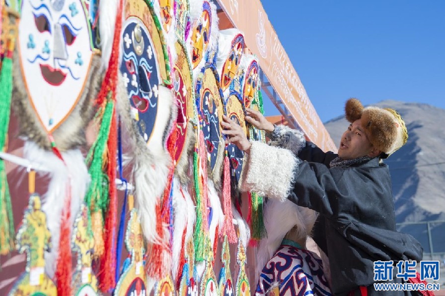 2月6日,達(dá)孜區(qū)阿古傳統(tǒng)藏戲服飾農(nóng)牧民專業(yè)合作社工作人員在交易會上推銷藏戲面具。新華網(wǎng) 旦增努布 攝