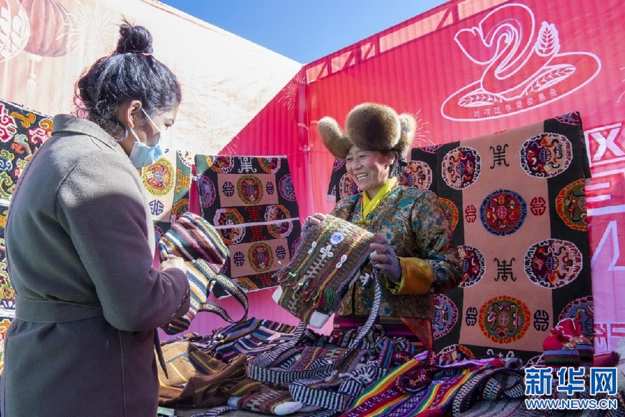 2月6日,達(dá)孜區(qū)旦卓婦女卡墊專業(yè)合作社工作人員在交易會上推銷傳統(tǒng)手工制品。新華網(wǎng)旦增努布攝