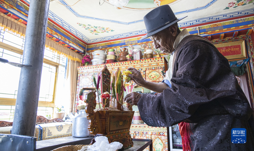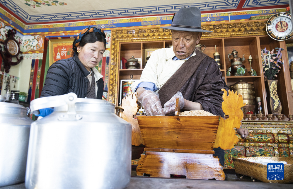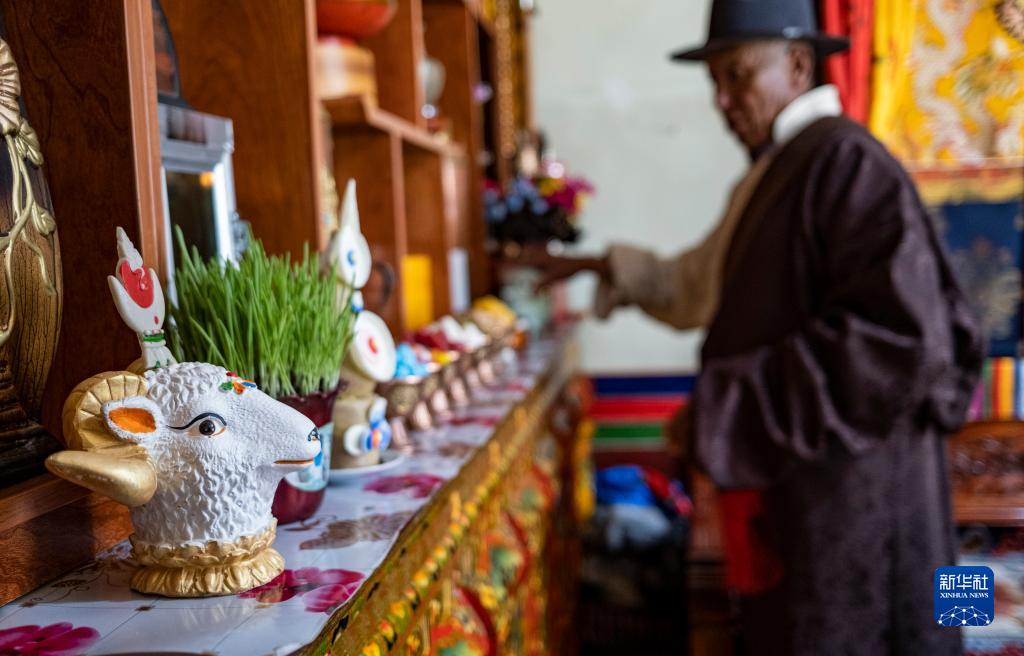 2月20日,在位于西藏拉薩市墨竹工卡縣門巴鄉(xiāng)的家中,扎西次仁用五彩青稞穗裝點(diǎn)象征吉祥的“切瑪”。新華社記者 孫非 攝
