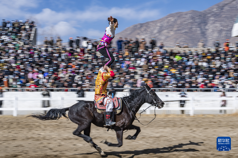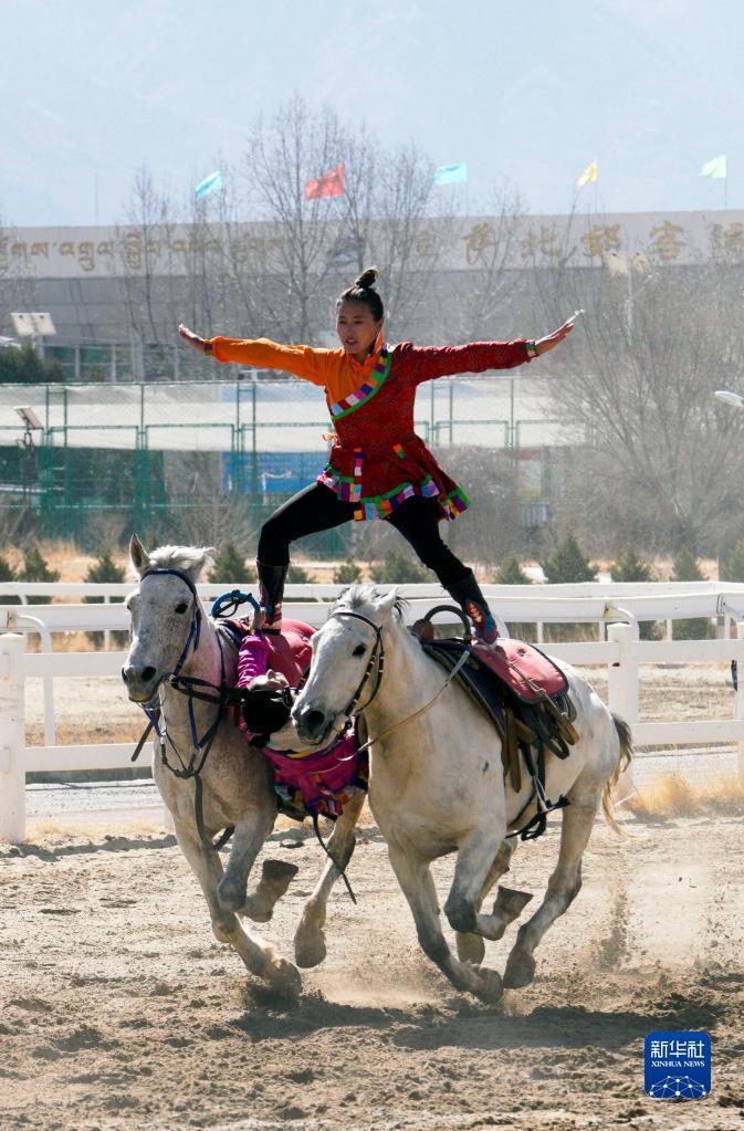 2月23日,騎手進(jìn)行單人雙馬表演。新華社發(fā)(丁增尼達(dá) 攝)