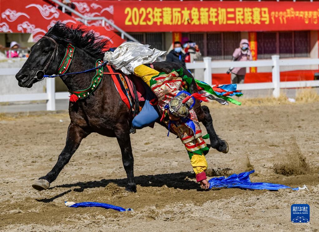 2月23日,騎手表演騎馬拾哈達(dá)。新華社記者 張汝鋒 攝