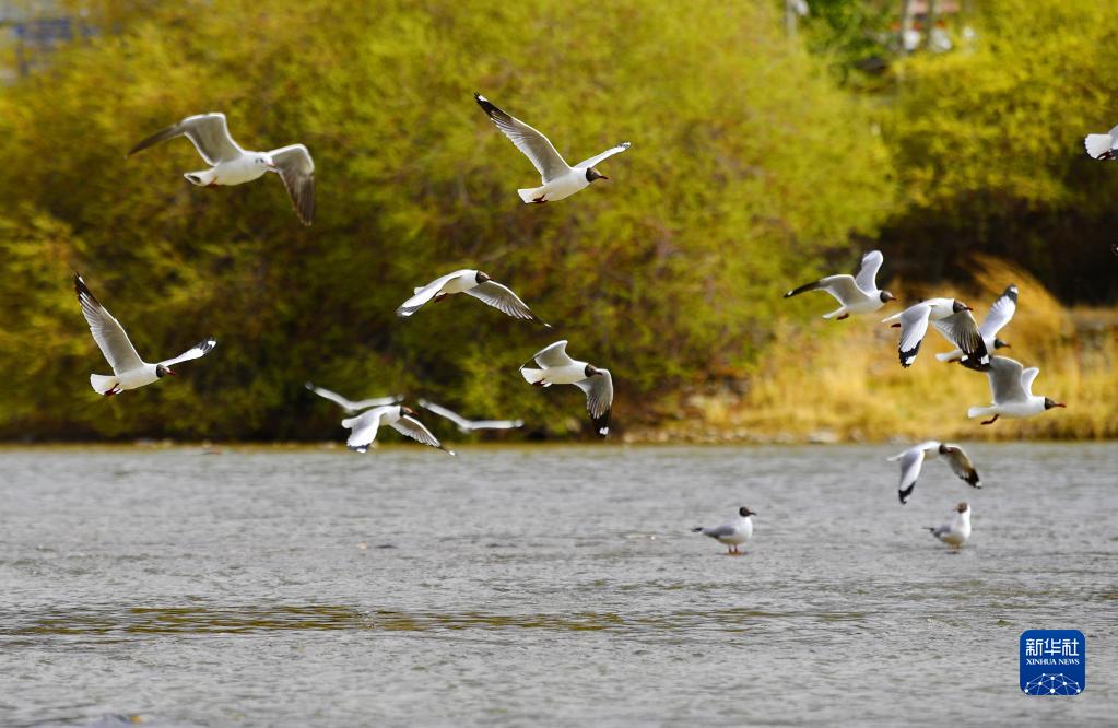 棕頭鷗盤旋在拉薩河上(4月16日攝)。新華社記者 張汝鋒 攝