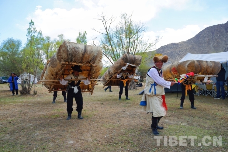 當(dāng)天恰好是周六,從拉薩來體驗(yàn)的游客不在少數(shù),有的是觀看了抖音直播就馬上騎車過來體驗(yàn)的。在營地,大家欣賞到了當(dāng)?shù)氐摹肮挝琛保ㄅFご瑁?,廓孜由邊唱邊跳的“阿熱”和身背牛皮船跳舞的“船夫”合作表演。“阿熱”是郭孜舞中的領(lǐng)舞者,跳牛皮船舞時(shí),“阿熱”手執(zhí)“塔塔”(五彩旗桿),唱著歌,跳著舞,另外4位舞者看著“阿熱”的動(dòng)作,背著重約80斤的牛皮船,用同樣的動(dòng)作跟著“阿熱”跳舞。大家動(dòng)作整齊,船漿擊打船舷的“咚咚”聲不絕于耳。