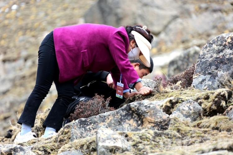 圖為游客在當(dāng)?shù)厝罕姷膸ьI(lǐng)下尋找蟲(chóng)草 攝影:王佳豪