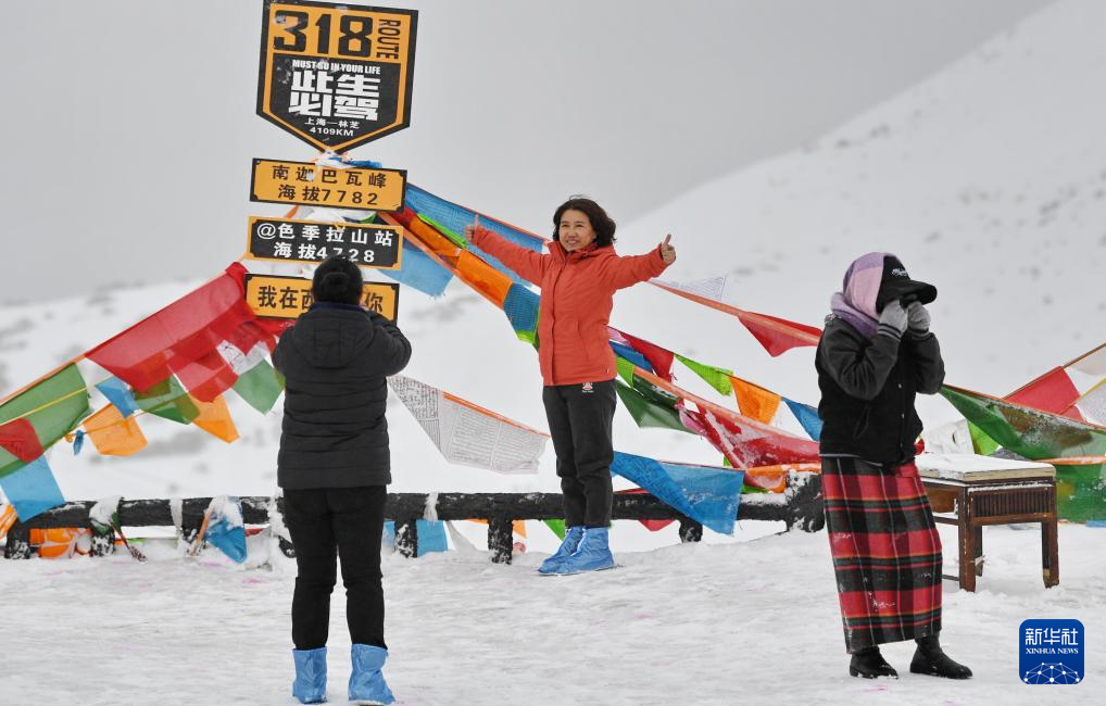 游客在林芝市色季拉山觀景臺拍照留影(4月19日攝)。新華社記者 張汝鋒 攝