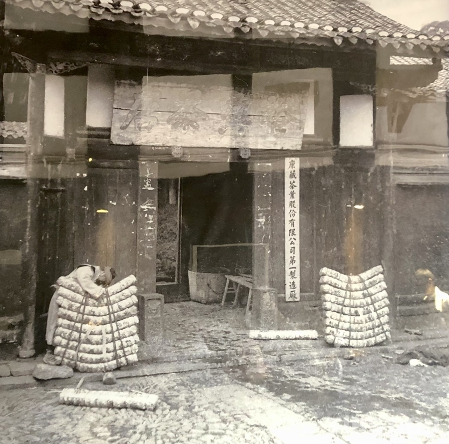 1939年,中國電影教育的開創(chuàng)者之一、時任金陵大學教師的孫明經(jīng)對西康進行了系統(tǒng)的考察,也為姜家大院留下了珍貴的影像資料。他拍攝到當時姜家大院大門口的情景:“裕興茶店”的匾額下,掛著“康藏茶葉股份有限公司第一制造廠”的木牌,大門兩邊各放著一背茶包,均為九條,左邊有一位女背夫,正在打捆茶包,整個茶包預估有200斤,而在當時,男背夫所要背負的重量要達到300斤左右。