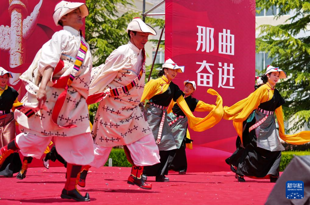 5月12日,在西藏職業(yè)技術(shù)學(xué)院職業(yè)教育活動(dòng)周啟動(dòng)儀式暨比如縣非物質(zhì)文化遺產(chǎn)進(jìn)校園活動(dòng)上,比如縣民族藝術(shù)團(tuán)的演職人員在表演節(jié)目。新華社記者 張汝鋒 攝