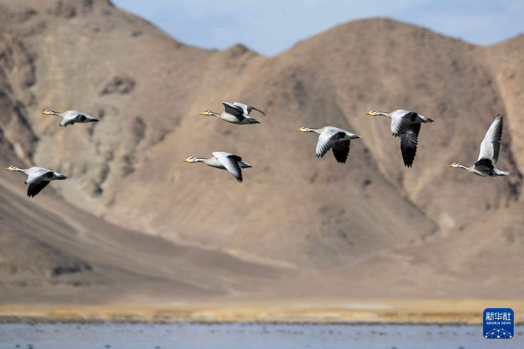 斑頭雁在班公湖上空飛翔(11月16日攝)。新華社記者 姜帆 攝 ??