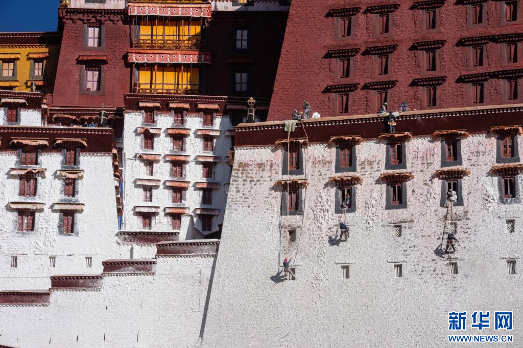 10月30日,布達(dá)拉宮管理處工作人員開展例行“潑甜墻”,對(duì)外墻進(jìn)行粉刷。新華社記者旦增尼瑪曲珠 攝