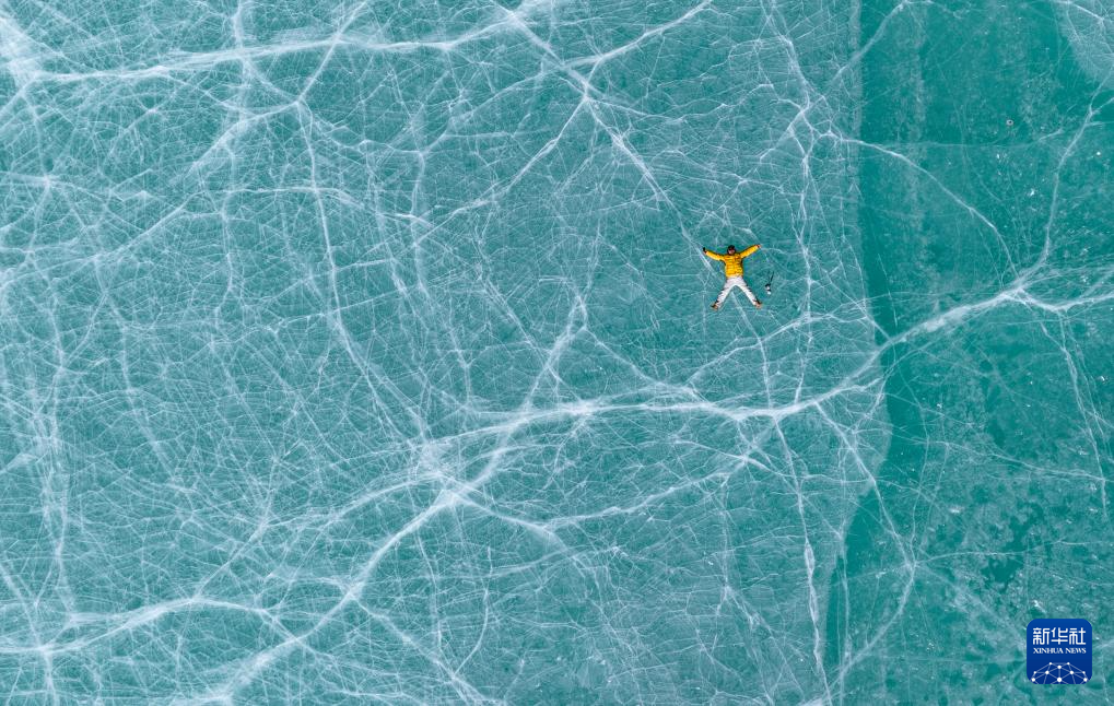 12月7日,一名游客躺在瓊穆崗嘎峰前的冰湖上拍照(無(wú)人機(jī)照片)。新華社記者 丁增尼達(dá) 攝 ??