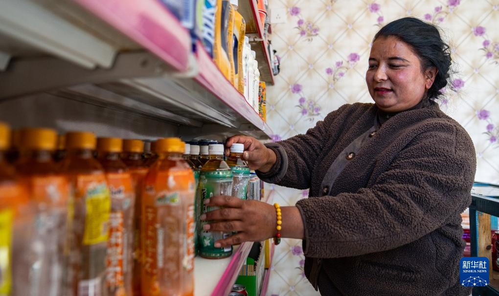 12月15日,一名達(dá)曼新村的婦女在自家商店里整理貨架。新華社記者 丁增尼達(dá) 攝 ??