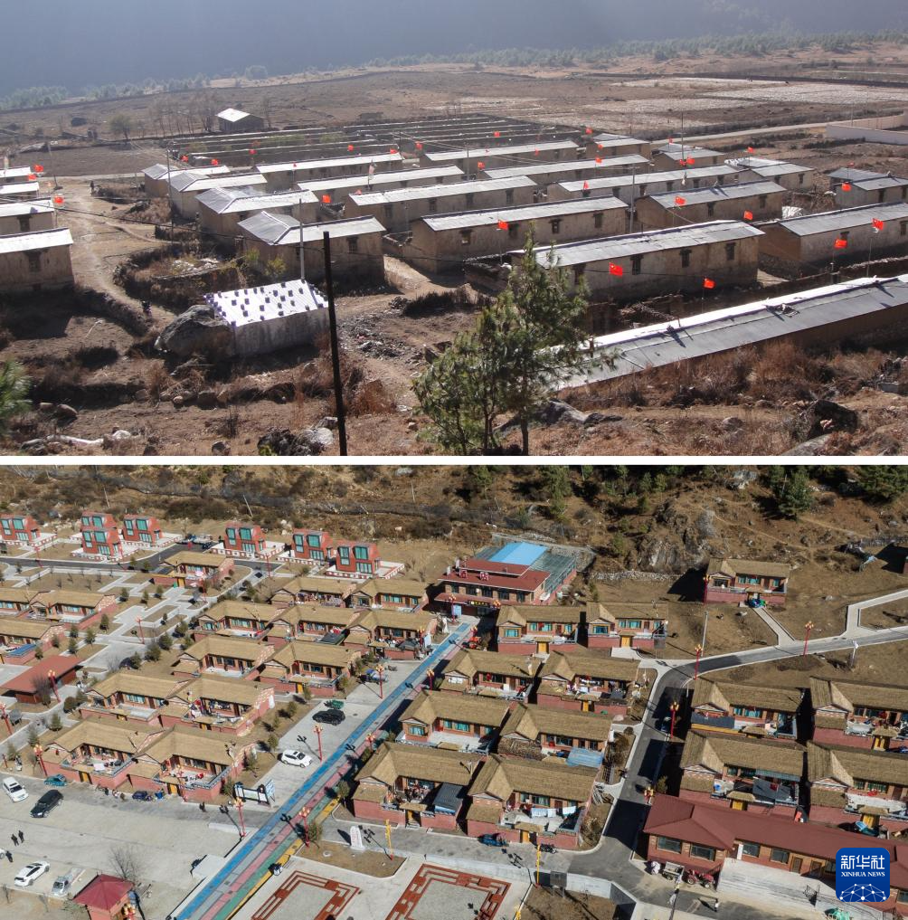 拼版照片,上圖為:2005年拍攝的達(dá)曼新村(新華社發(fā));下圖為:2024年12月15日拍攝的達(dá)曼新村(無人機照片,新華社記者丁增尼達(dá)攝)。新華社發(fā) ??