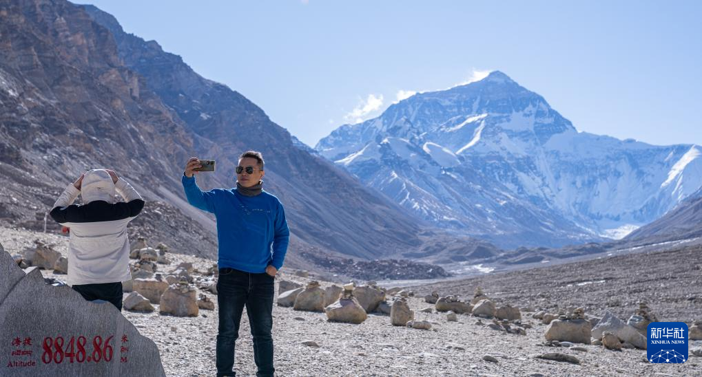 12月14日,游客在珠穆朗瑪峰高程測(cè)量紀(jì)念碑旁拍照留念。新華社記者 丁增尼達(dá) 攝