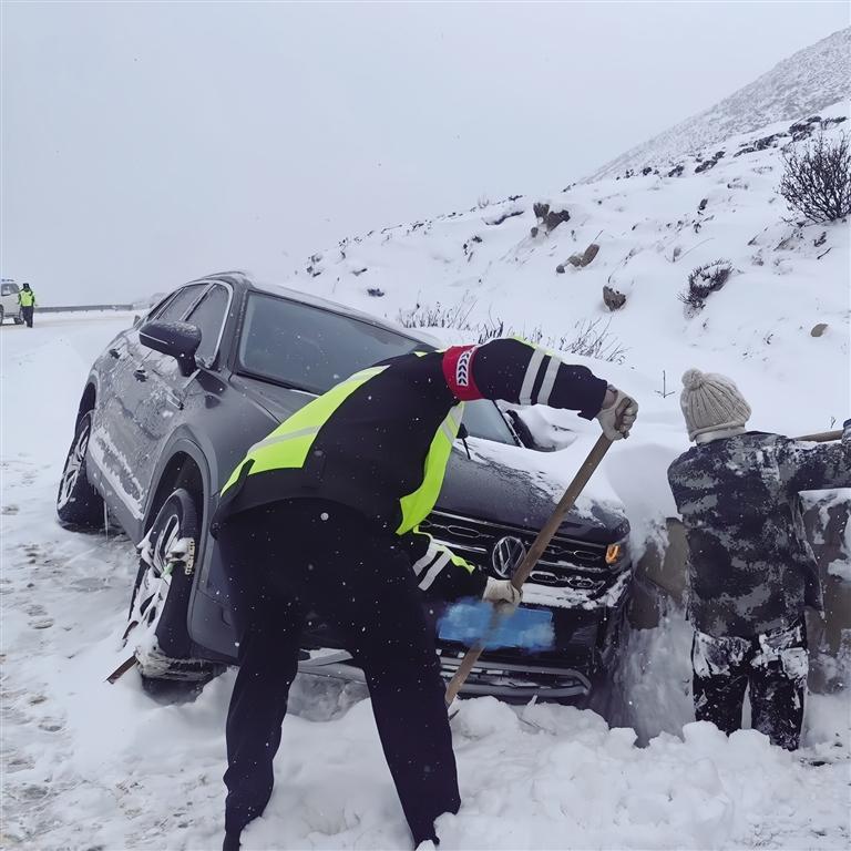 民警雪天救援被困車輛。 圖由自治區(qū)公安廳交管局提供