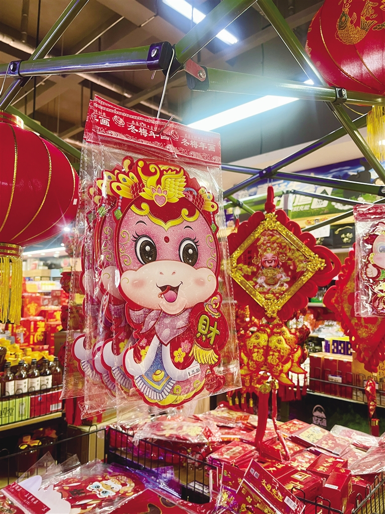 在永輝、百益等商超里,新年的氛圍同樣濃厚。超市入口處最顯眼的位置掛出了紅艷艷的對聯(lián)、燈籠、錦鯉小掛飾、金蛇送福貼紙等新春飾品,供顧客們選購。這些春聯(lián)和掛飾價格在十幾元至幾十元不等,款式豐富,寓意美好,深受人們喜愛。