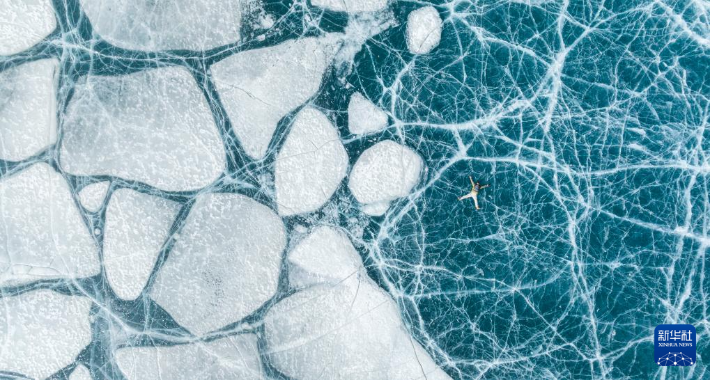 一名游客躺在恰央錯(cuò)結(jié)冰的湖面上拍照(1月26日攝,無(wú)人機(jī)照片)。新華社記者 丁增尼達(dá) 攝