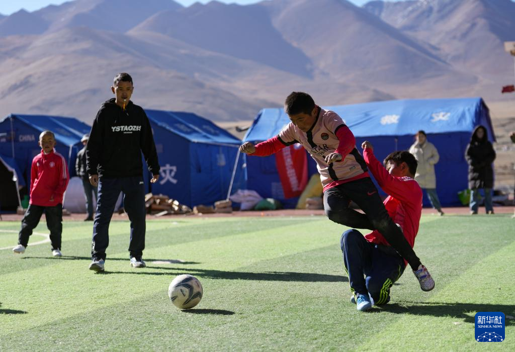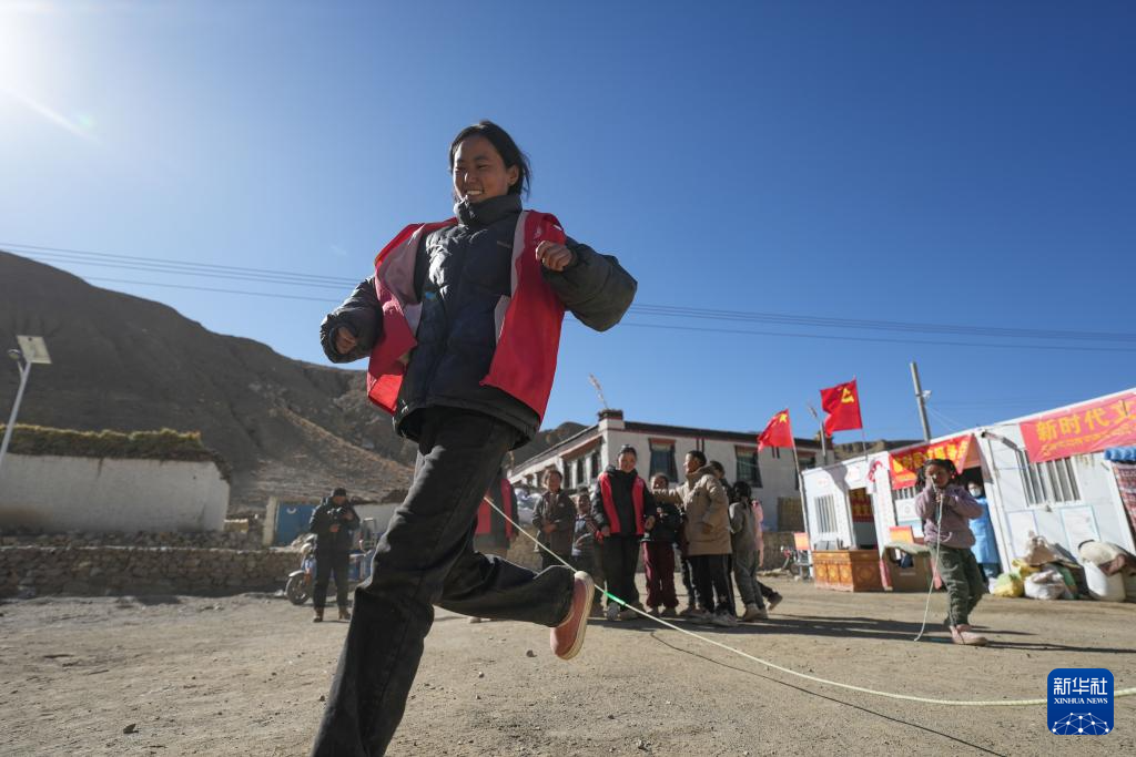 1月25日,在定日縣曲洛鄉(xiāng)熱木青村安置點,大學(xué)生志愿者在安置點和孩子們一起玩游戲。新華社記者 晉美多吉 攝??