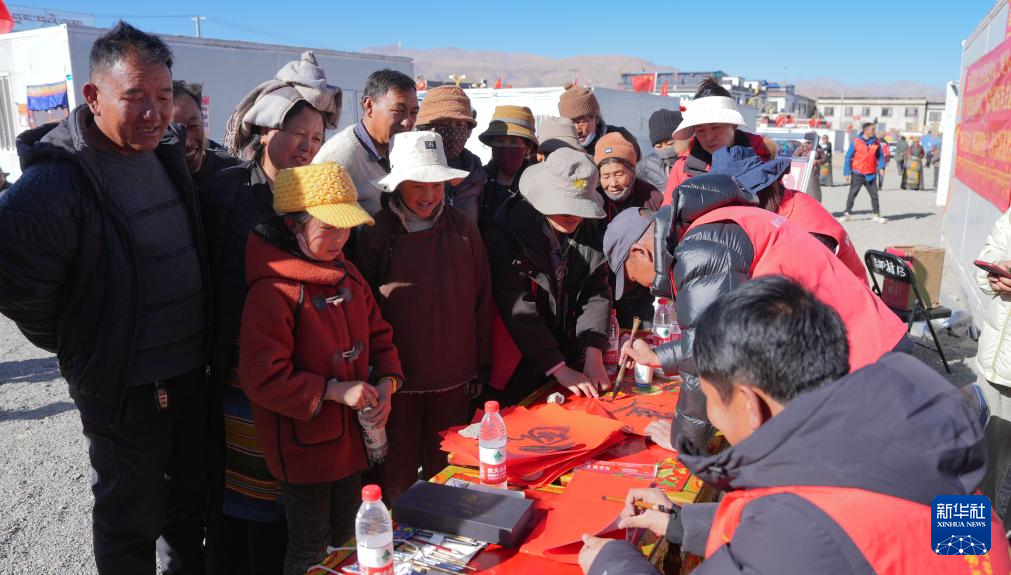 1月26日,書法家協(xié)會的志愿者在拉孜縣吉如村安置點為受災(zāi)群眾書寫春聯(lián)。新華社記者 晉美多吉 攝?