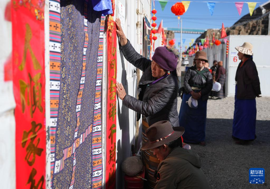 1月26日,拉孜縣吉如村安置點群眾在張貼春聯(lián)。新華社記者 晉美多吉 攝 ??
