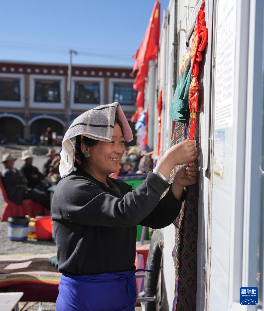 1月26日,拉孜縣吉如村安置點群眾在掛吉祥結(jié)。新華社記者 晉美多吉 攝?