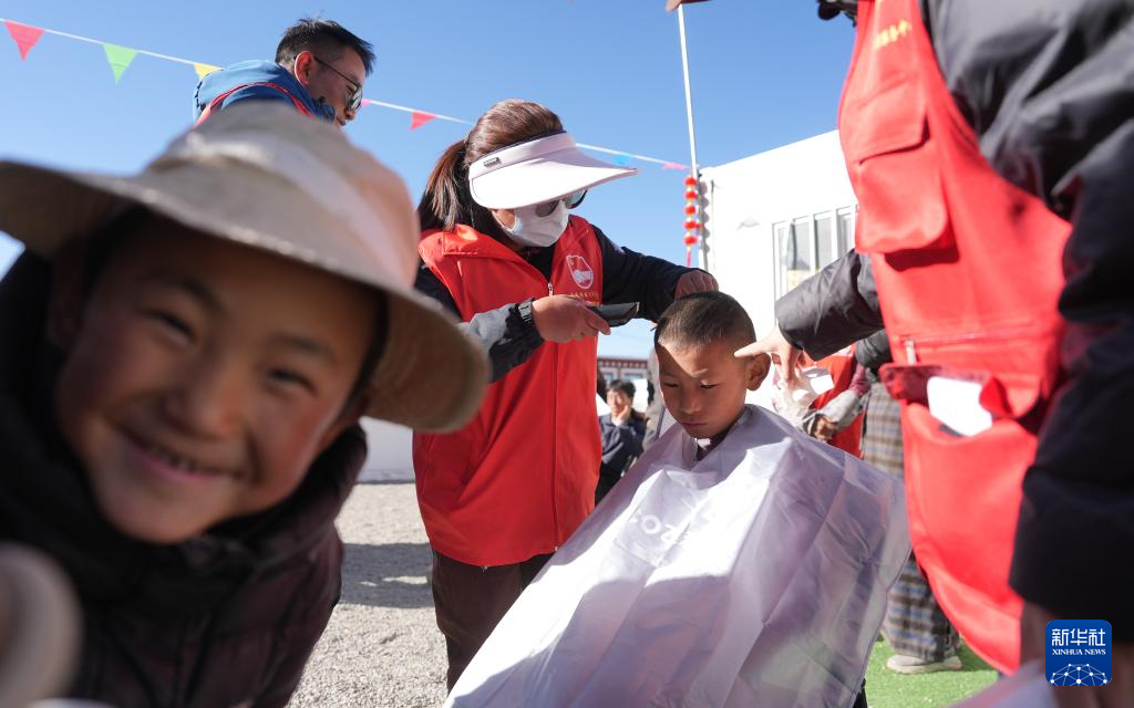 1月26日,志愿者在拉孜縣吉如村安置點給孩子們理發(fā)。新華社記者 晉美多吉 攝?