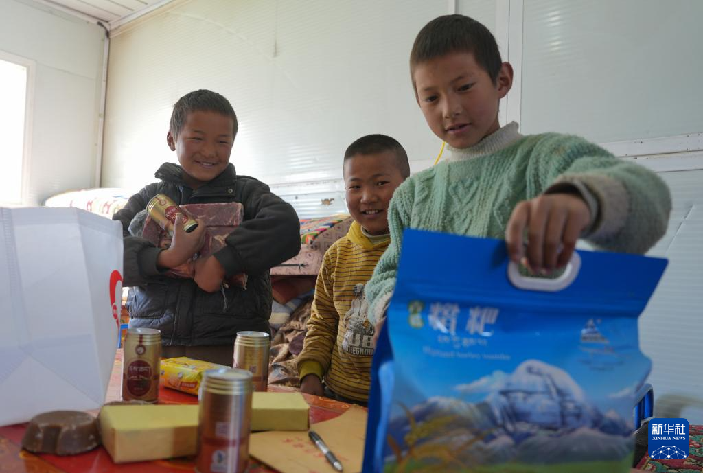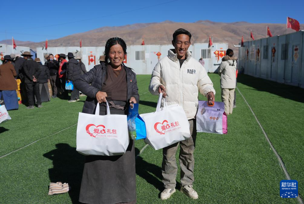 1月27日,拉孜縣加嘎村安置點受災(zāi)群眾領(lǐng)到新年大禮包。新華社記者 晉美多吉 攝?