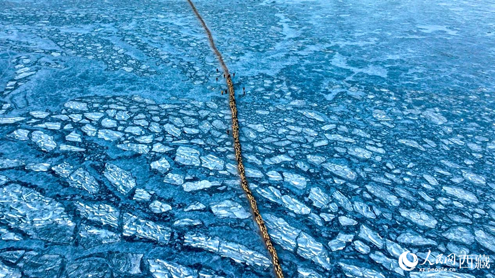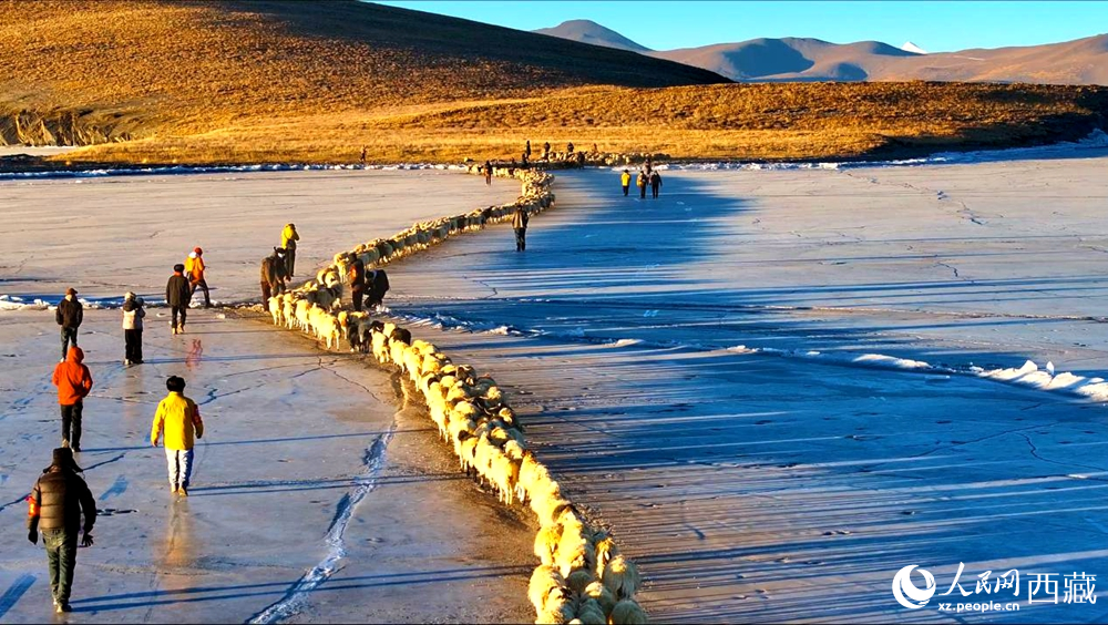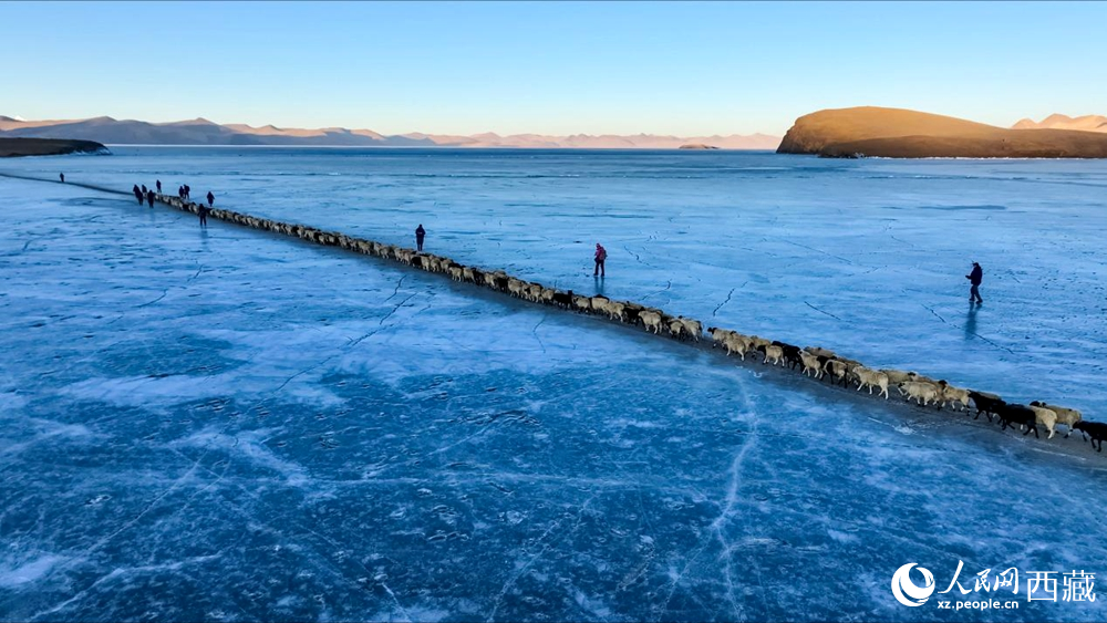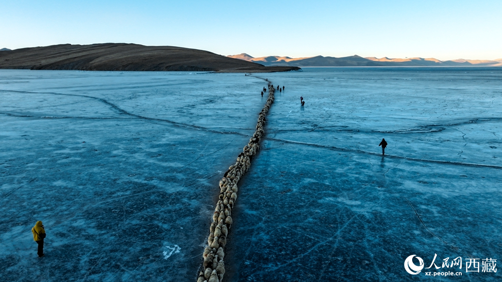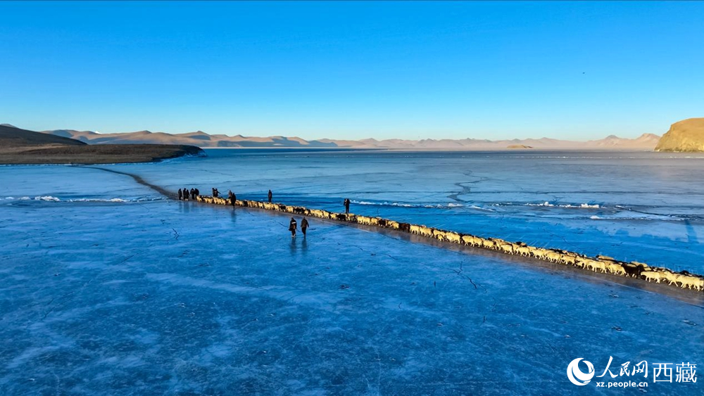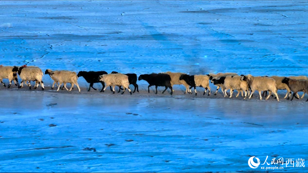 隨著一聲號(hào)令,牧民們驅(qū)趕著羊群,踏上冰封的湖面。遠(yuǎn)遠(yuǎn)望去,羊群如同一串串黑白相間的珍珠,在湛藍(lán)的冰面上緩緩移動(dòng),構(gòu)成一幅壯美的高原畫卷。
