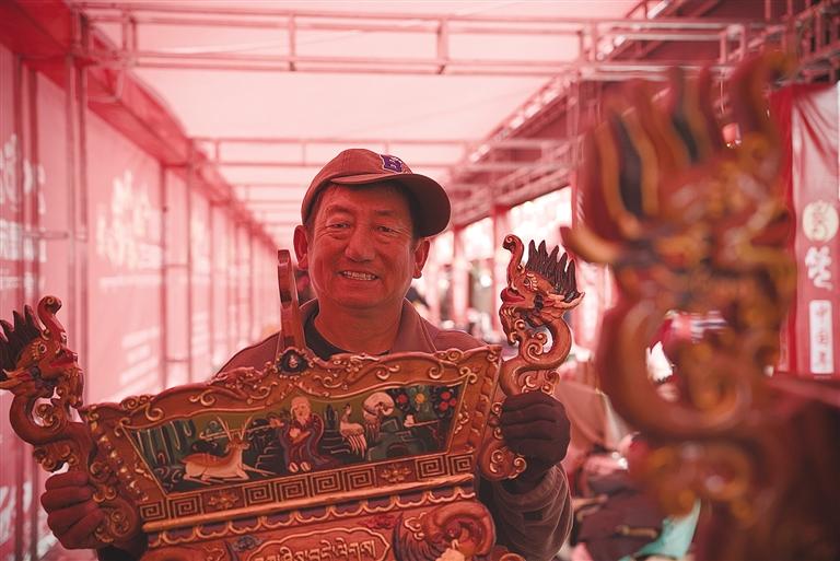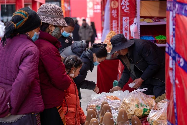 據(jù)悉,此次堆龍德慶區(qū)的年貨節(jié)以“逛展位、享樂購、觀演藝、送政策、寫祝?!睘槲宕蠛诵牧咙c。參展商戶共有118戶,其中既有堆龍本土企業(yè)和合作社帶來的藏歷新年年貨、農(nóng)畜加工產(chǎn)品、民族手工藝品、傳統(tǒng)服飾,也有山南錯那市相關企業(yè)帶來的特色產(chǎn)品,品類總數(shù)達百余種。開幕當日人流量達1000余人,銷售額10萬余元,呈現(xiàn)出購銷兩旺的熱鬧景象。攤主土旦羅布介紹:“這次我?guī)砹瞬貧v新年禮盒套裝,里面不僅包含了藏文對聯(lián)和吉祥八寶紅包,還有‘古突’里可包裹的12種代表不同寓意的簽文及寓意,很有過年的儀式感,非常受市民歡迎?!?/p>
