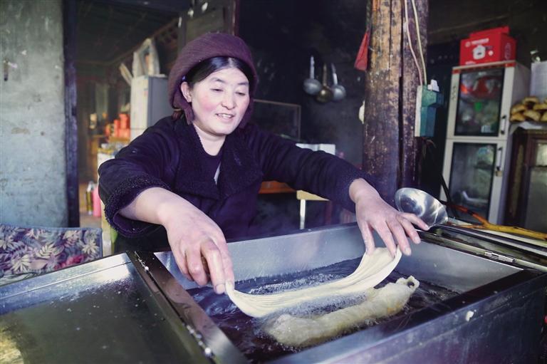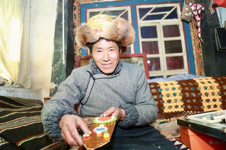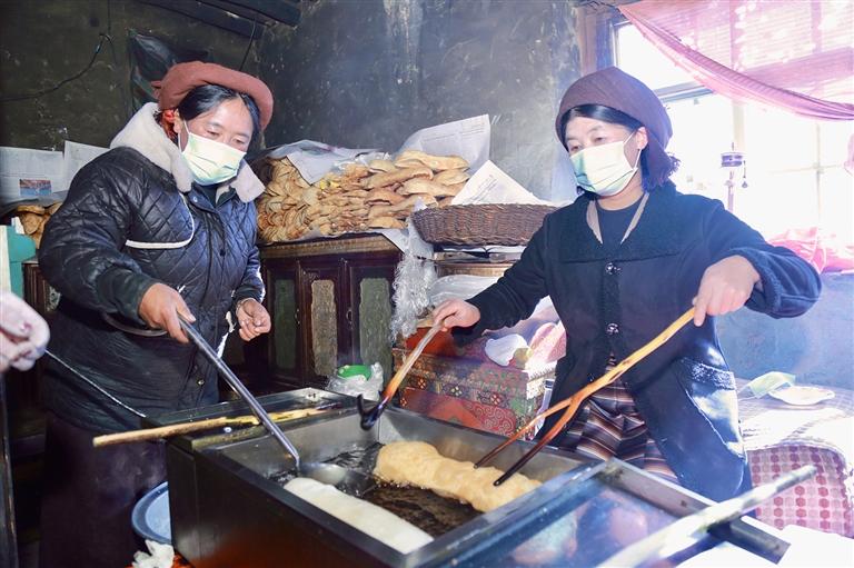 “德卡”,作為傳統(tǒng)藏式點心“卡塞”的一種,在藏歷新年的年貨清單里占據(jù)著不可或缺的位置。每到藏歷新年前夕,旦索朗一家便進入了一年中最忙碌的時段——經(jīng)營起制作和售賣卡塞的生意。旦索朗回憶起小時候的新年,感慨萬分:“小時候過年,家家戶戶都自己炸卡塞,那時候,整個村子都被卡塞的濃香包圍著?,F(xiàn)在生活條件好了,很多人覺得在外購買德卡更方便省事,這也給我們帶來了商機。我們做炸德卡的生意已經(jīng)6年了,一直都很受歡迎,還帶動了6名村民一起參與,增加了大家的收入?!?/p>